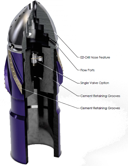 The Ezi-Drill nose feature is designed to withstand high set-down weights when running the casing to T.D. during drill out, the aluminum will break into small chips to avoid ‘bird-nestingˇ of the bit to allow for a quick drill-out tim